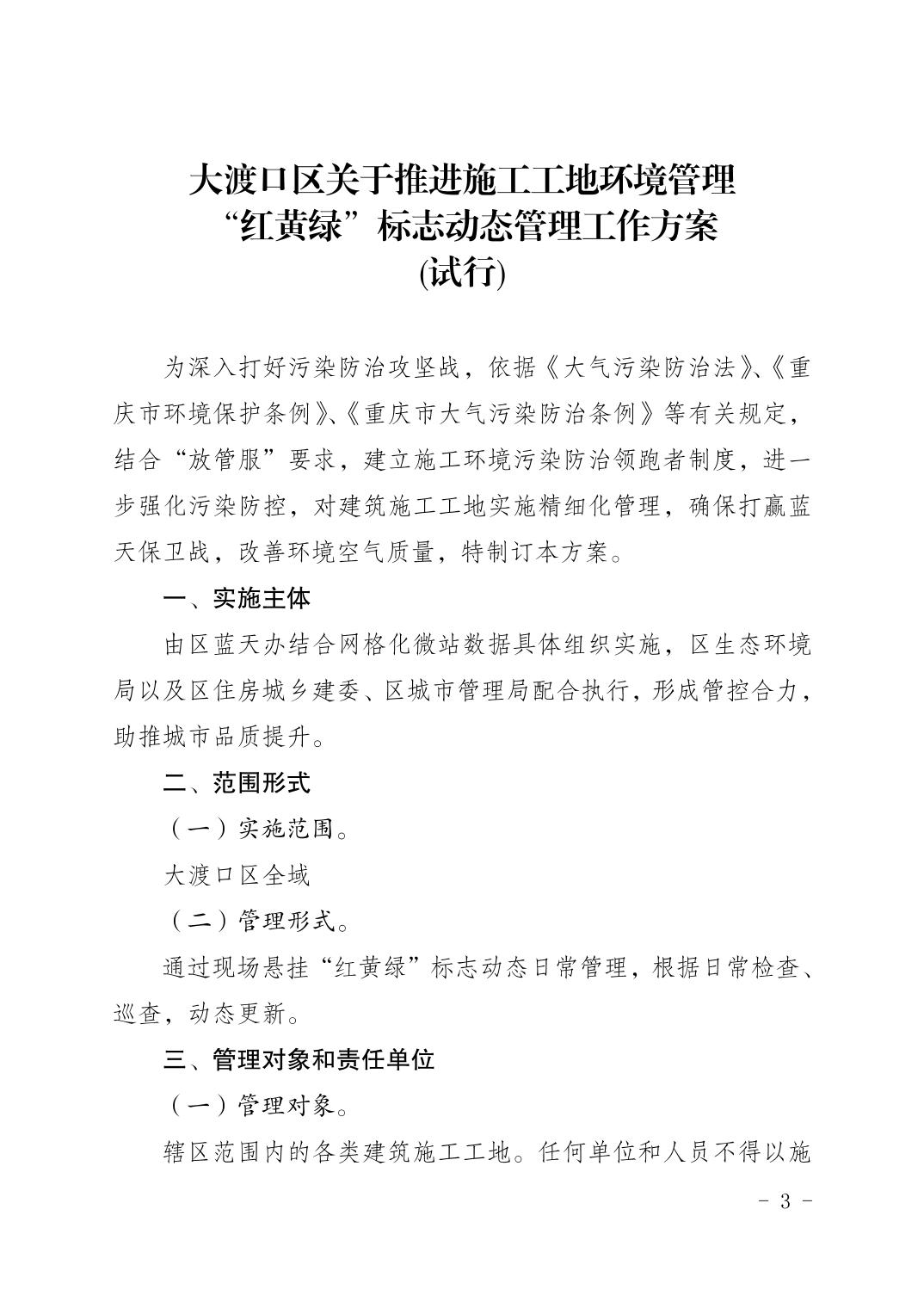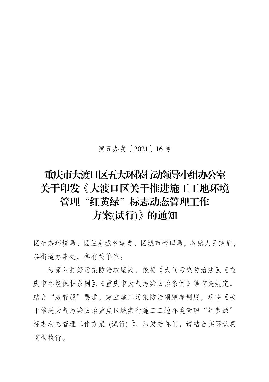 重庆市365bet网站平台_365国际体育官网_o365邮箱五大环保行动领导小组办公室关于印发《365bet网站平台_365国际体育官网_o365邮箱关于推进施工工地环境管理“红黄绿”标志动态管理工作方案(试行)》的通知渡五办发【2021】16号