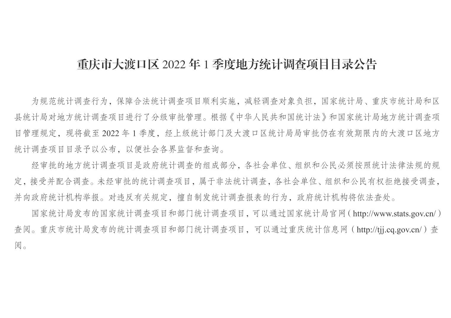 重庆市365bet网站平台_365国际体育官网_o365邮箱2022年1季度地方统计调查项目目录公告